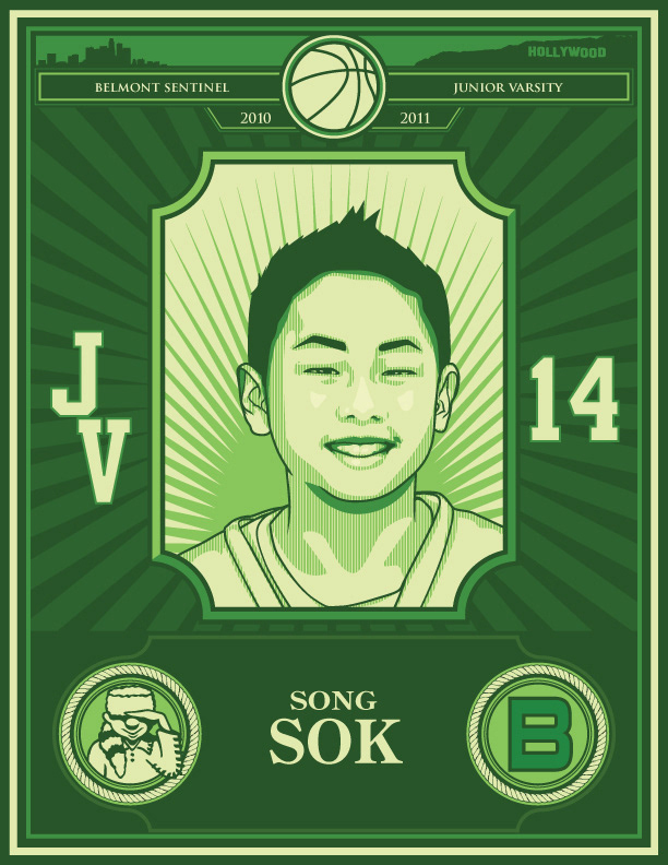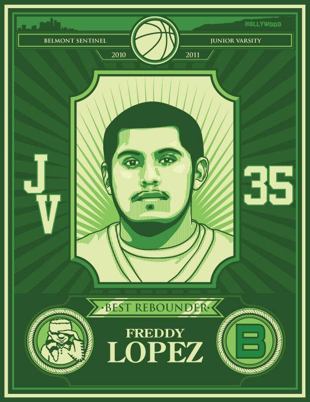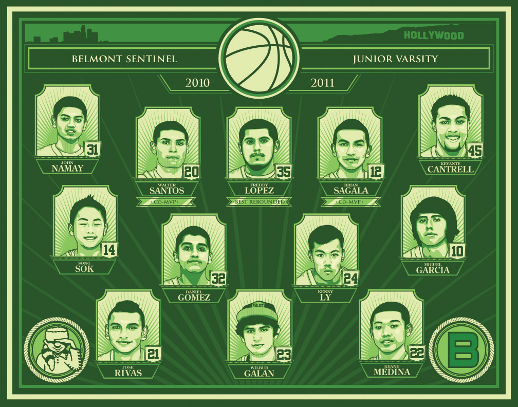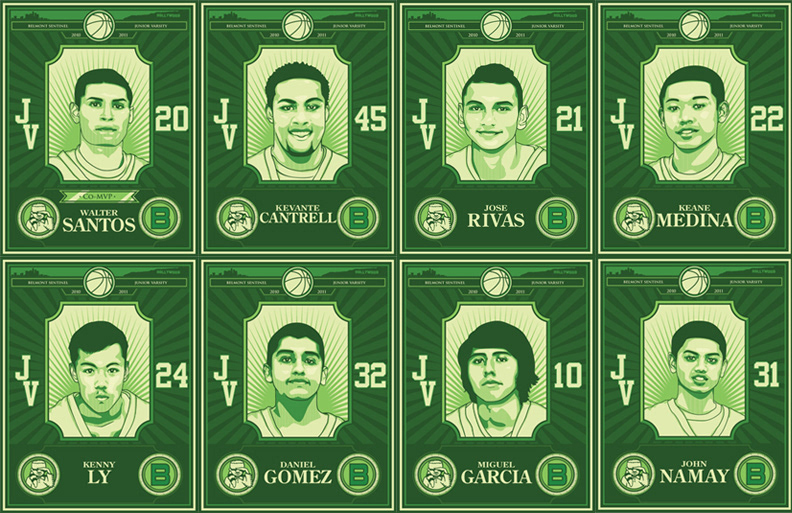 8 digital illustration project for Belmont basketball JV team. Inspired by Hydro74 and Shepard F.